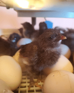 - Leave the hatched chicks in the incubator until they are fully dry. Right before they hatch, they consume the last of the egg yolk (their food source). This provides them energy to be able to break out of their shell and for a couple days after they hatch. They can stay in the incubator for up to 48 hours after they’ve hatched. Once they are dry, move them into the brooder (a small confinement space to keep baby chicks in – whether it be a stock tank or an actual brooder). You want the brooder to be very warm. But also allow a space where they can move away from the heat if it is too warm for them. Chicks that are freshly hatched up to a week old will need a temperature of 95 degrees Fahrenheit.